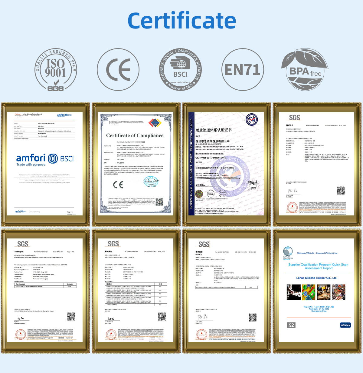 All of our products are made of pro-environmental BPA free silicone material, can reach a wide variety of export certifications. Also our factory has the audit of ISO 9001 and BSCI.